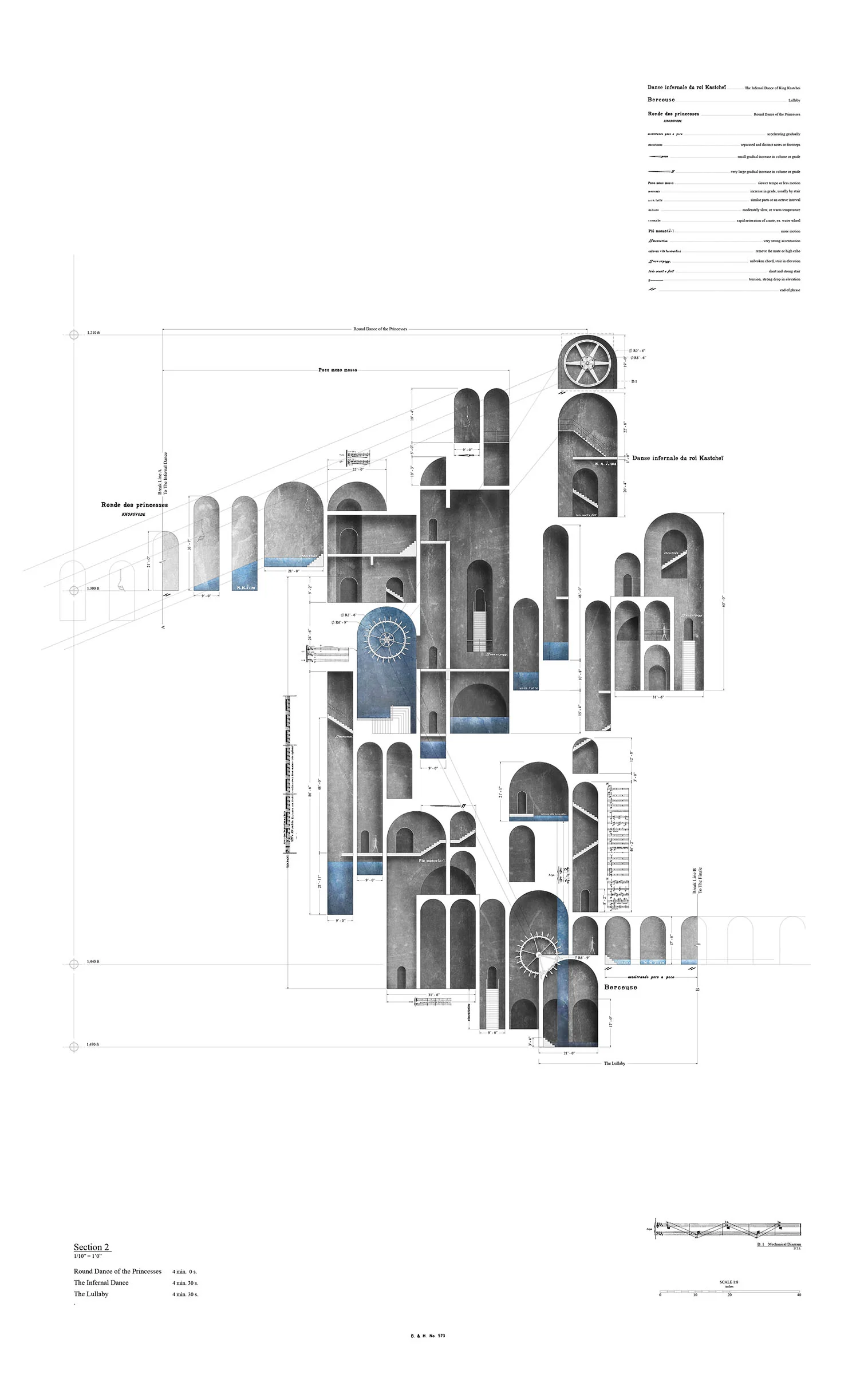 Through the development of a new architectural notation, which merges technical construction documentation with the expressive language of musical notation, the project reimagines architecture as a score to be read, felt, and inhabited. In this notation, architectural materials extend beyond the physical (texture, scale, light, shadow, and spatial sequencing) to include temporal and expressive devices drawn from music: crescendos and decrescendos as spatial intensities, staccatos as abrupt shifts in rhythm or form, legatos as fluid continuous spatial flows, and fermatas as moments of stillness and pause.